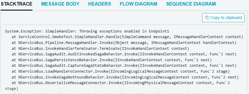 Each message can be browsed to see in-depth details about a given message. Individual messages can be accessed by clicking the respective entry in any of the message list views. If it's a failed message, it can be deleted or retried.